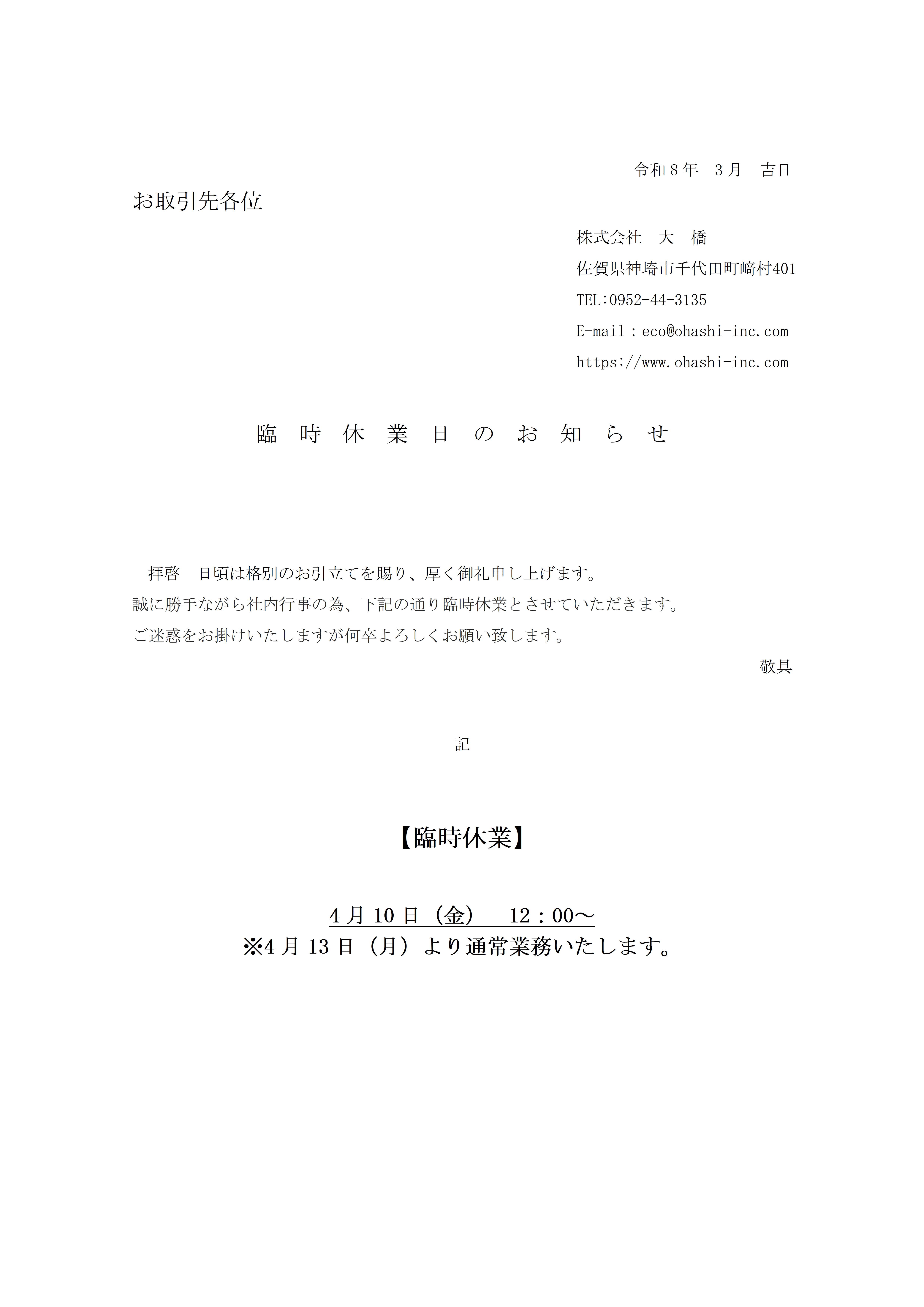臨時休業のお知らせ